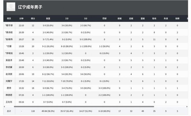 辽宁男篮:俞泽辰21分6板1助2帽、付豪20分5板3助、原帅18分1板1助、刘雁宇14分6板1助、赵继伟12分4板9助、鄢手骐12分2板2助、韩德君7分1板、李虎翼6分4板1助2断、高诗岩4分2板8助2断。