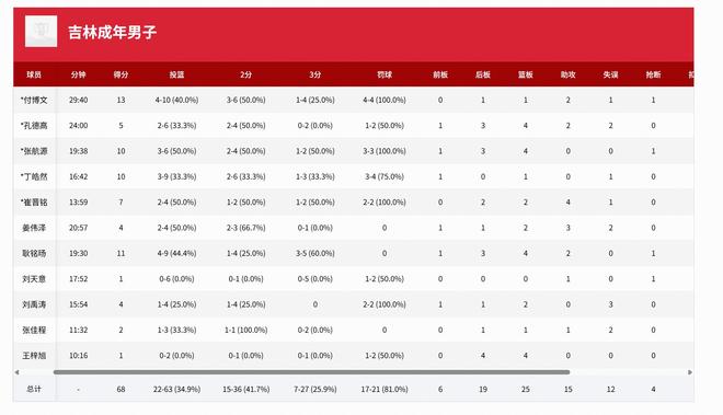 吉林男篮:付博文13分1板2助、耿铭旸11分4板1助、张航源10分3板、丁皓然10分1板、崔晋铭7分2板4助、姜伟泽4分2板3助、刘禹涛4分2板;