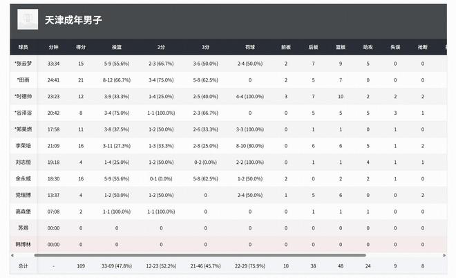 天津男篮:田雨21分7板、李荣培16分6板5助2断、余永威16分2板2助、张云梦15分9板5助、时德帅12分10板2助2断、郑昊燃11分1板、谷泽浴8分5板5助。